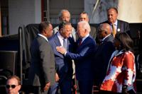 Rev. Jesse Jackson, second from left, and PRESIDENT JOSEPH BIDEN, center, speak during the 58th Bridge Crossing Jubilee in Selma, Alabama on March 5, 2023. The event commemorates the 1965 Selma to Montgomery march known as Bloody Sunday.