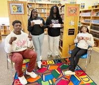 They are Devin Woods (first place), S'miahy Carter, Elijah Acoff, Arianna White, and Dylan Barnett. Victoria Milhouse (second place), and Patrick Rudolph (third place) are not pictured. Students were awarded Visa gift cards, Domino's gift cards, and Taco Bell food vouchers. This competition was conducted by Cathryn Dozier, the library media specialist.Â