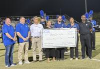 During the football game against Shelby County, the foundation leaders presented band directors Caleb Acton and Brianna Jarvis with a check for $12,000 to help continue to build the River City Blue Marching Band. The band will use the funds to purchase new instruments.