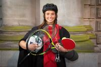 Lorna Husband has her hands full of sports equipment she used to try a new sport every week for a year. (Edinburgh Napier University via SWNS)