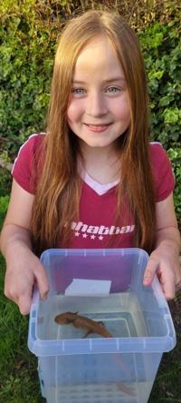 The nature-loving youngster spotted the 9-inch (22 cm) pale salamander, which was nestled in the rocks, after lifting up a discarded mat in the river and rushed to tell her excited mother.