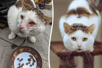 Despite his injuries causing his face to become misshapen, he was adopted by an animal-loving couple.