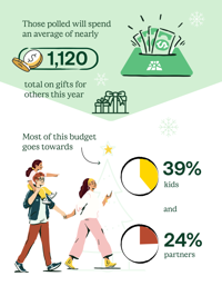 Most of their budget goes towards kids (39%) and partners (24%), averaging about $620 between the two. Parents (15%), friends (13%), coworkers (4%) and service providers (5%) round out the rest of their budgets and gift lists.