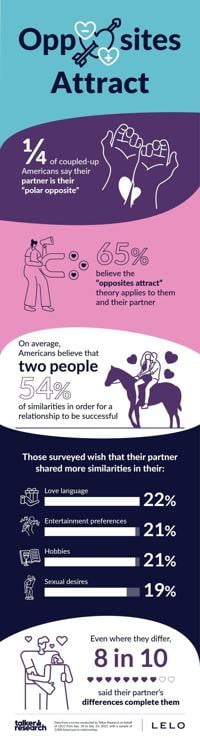 Further, the survey conducted by Talker Research for LELO found that 65% believe the “opposites attract” theory applies to them and their partner.
