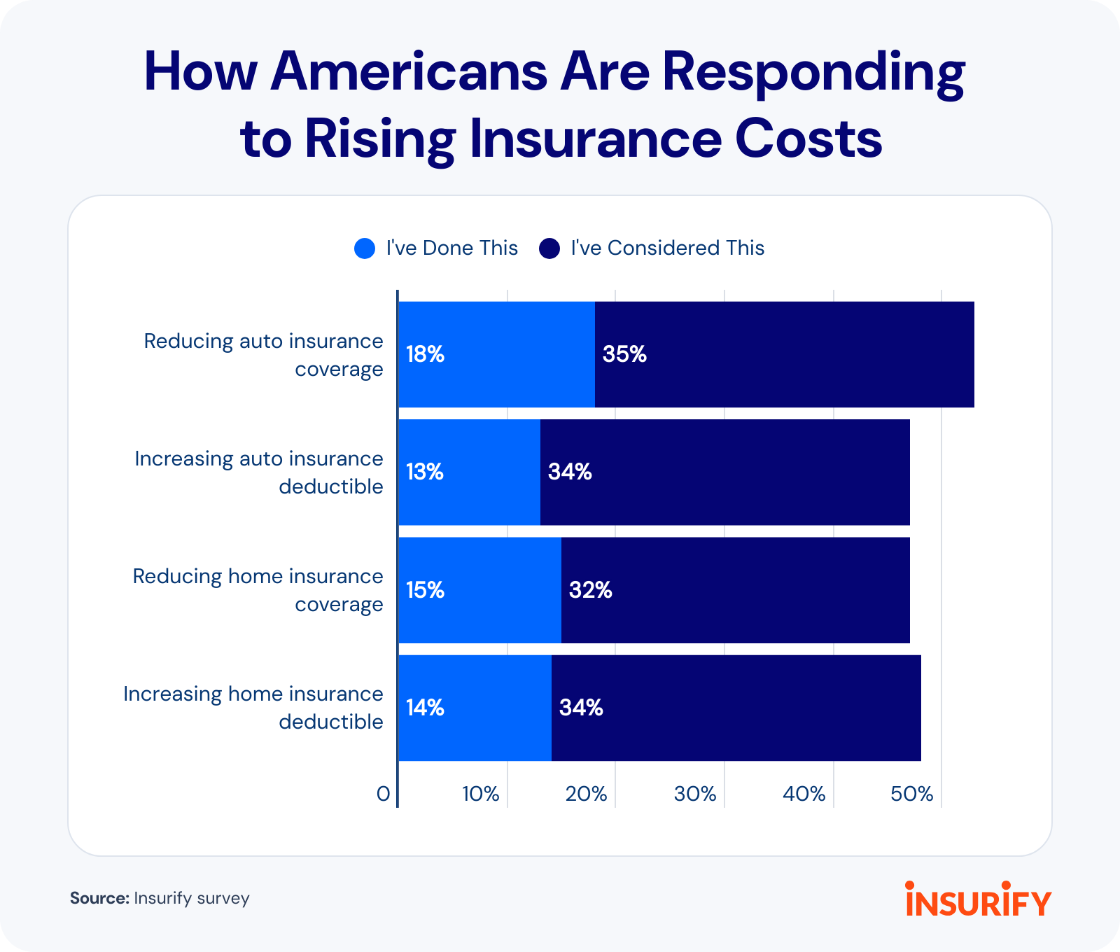 Insurify’s survey also found that 47% of those with home insurance have considered reducing their coverage because of financial concerns, including 15% who already have. Lowering one’s home insurance coverage could leave homeowners financially exposed to major losses if their home is damaged or destroyed, especially as certain natural disasters become more frequent and intense.1