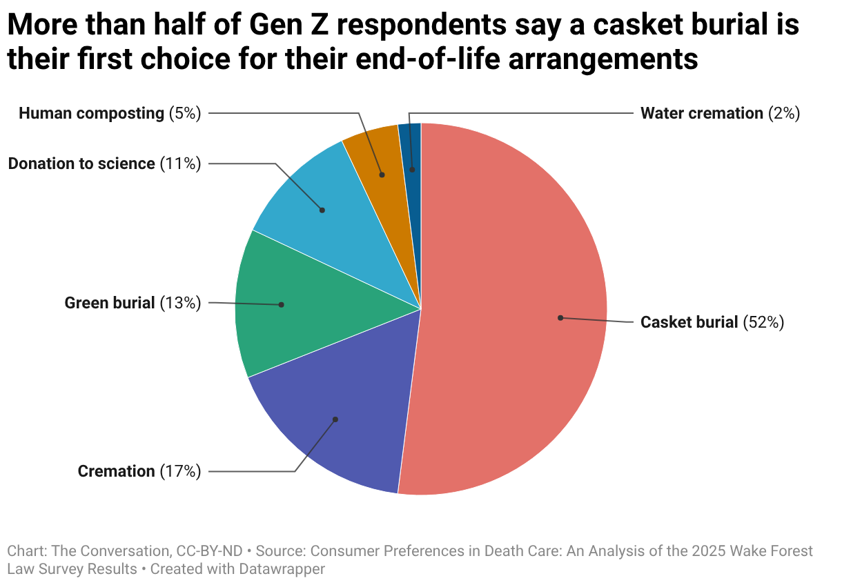 The survey does show that conservative respondents strongly preferred casket burial over cremation – 53.1% to 28.4% – and that Roman Catholic or Protestant respondents were significantly more likely to favor casket burial. If Gen Z is trending in those directions, a preference for traditional burial would make sense.