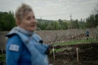 The snail's pace of the meticulous process exasperates farmer Kniazev, who rattles off his gripes with the demining groups at machine gun pace.