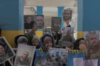 Once inside, they were still visible through a window. Some of the women outside pressed photos of missing soldiers up against it. One of the former prisoners stepped forward to examine them, shaking his head in front of each one.