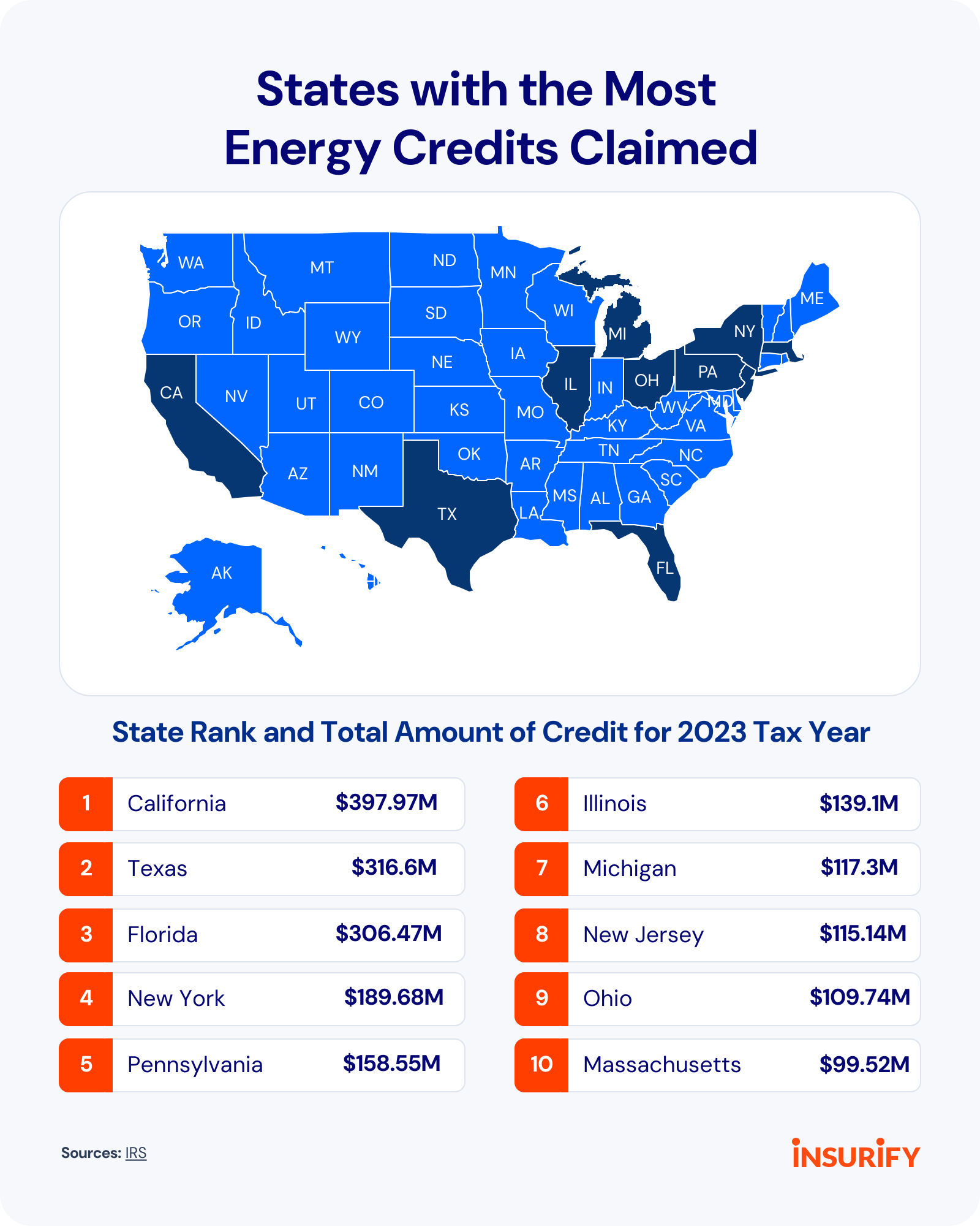 Some states with a higher percentage of homeowners claiming energy tax credits also have high average homeowners insurance costs. For example, Florida, which ranks third for residential tax credits, has the highest home insurance costs in the country, averaging $14,140 per year.