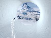 Standing at 12.5 meters high, the rotating tunnel is lined with real powder snow made from water and air to offer an "endless mountain" of constantly rideable surface area.