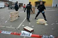 Forensics teams worked to gather evidence from the site of the stabbing in Mulhouse before the rain washed it away