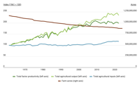 - Agricultural productivity has grown significantly. Since the 1960s, total farm output has more than doubled, while inputs have remained relatively stable. This rise in productivity is driven by technological innovation, improved crop genetics and better farm management.