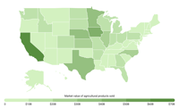 - A small number of states dominate production. Just three states – California, Iowa and Texas – account for 25% of the total market value of all agricultural goods sold in the U.S., reflecting both the scale and specialization of their agricultural sectors.