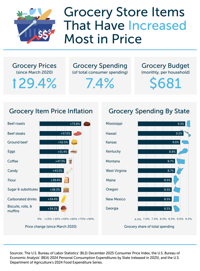 - Mississippi and Hawaii households spend the largest share of their budgets on groceries. Mississippi households allocate 9.3% of total consumer spending to groceries—the highest in the U.S.—followed closely by Hawaii at 9.2%.