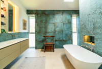 Elegant bathrooms and carefully curated natural materials throughout the home create an atmosphere of "calm luxury."