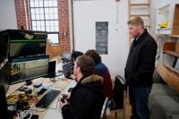 In a lab, company staff monitor the yellow robot on screens, using what looks like a video game console to direct its movements.