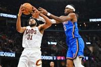 Cleveland's Jarrett Allen, grabbing a rebound over Oklahoma City's Shai Gilgeous-Alexander, scored 25 points to lead the Cavaliers over the Thunder 129-122 in a showdown of the NBA's top clubs