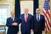 In photos released by the White House, Munir stands by Sharif and Trump in a suit and tie, raising eyebrows at home given army chiefs have in the past worn uniform during official visits.