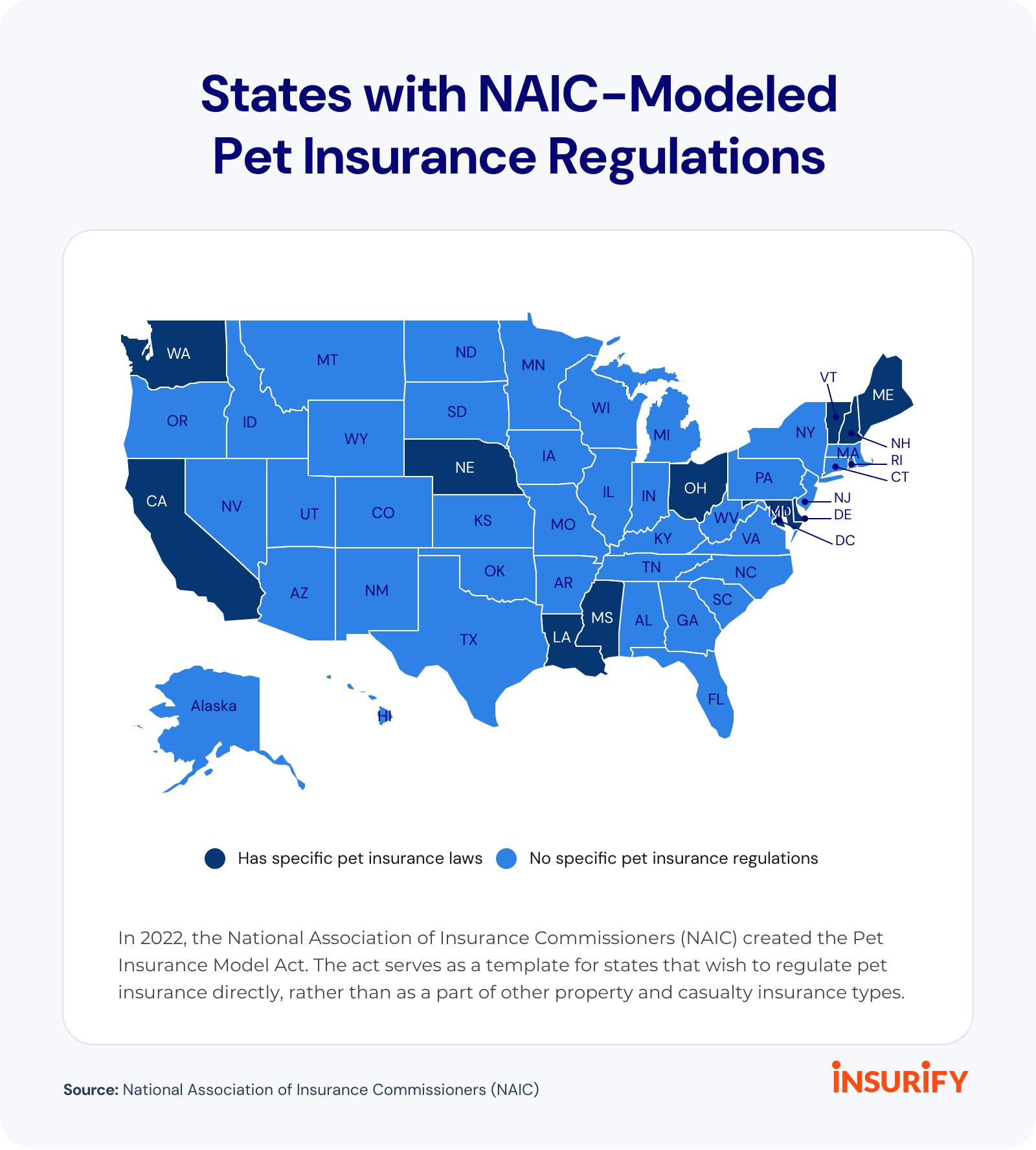 Currently, 11 states have specific laws regulating pet insurance, according to the National Association of Insurance Commissioners (NAIC), which created a model law for state regulators in 2022.