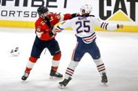 Florida's Jonah Gadjovich fights with Edmonton's Darnell Nurse during the third quarter of the Panthers 6-1 rout of the Oilers in the Stanley Cup Final