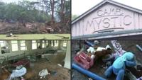 People look on as law enforcement and volunteers search for missing people near Camp Mystic