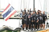 Her team, dressed in matching black sailing attire, celebrated earlier aboard their boat with cheers, while one sailor waved the Thai national flag.