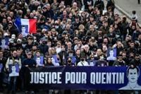 The crowd -- many wearing black and some covering their lower faces with masks -- marched through the city of Lyon carrying flowers and placards bearing pictures of Quentin Deranque and the words, "justice for Quentin" and "the extreme left kills".