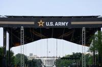 Soldiers gather next to an US Army AH-64 Apache helicopter on display on the National Mall during the Army 250th anniversary celebration