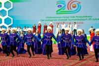 Hundreds of green Turkmen flags fluttered in the desert wind, held up by women in red, purple, blue and green outfits.