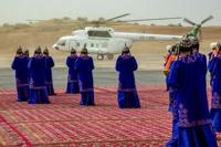 Berdymukhamedov touched down at the ceremony in a white helicopter, where a traditional carpet was laid out across the tarmac.