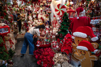Shop fronts can be seen bustling with Christmas trees, neatly decorated wreaths, stockings, candy canes, and other festive ornaments.