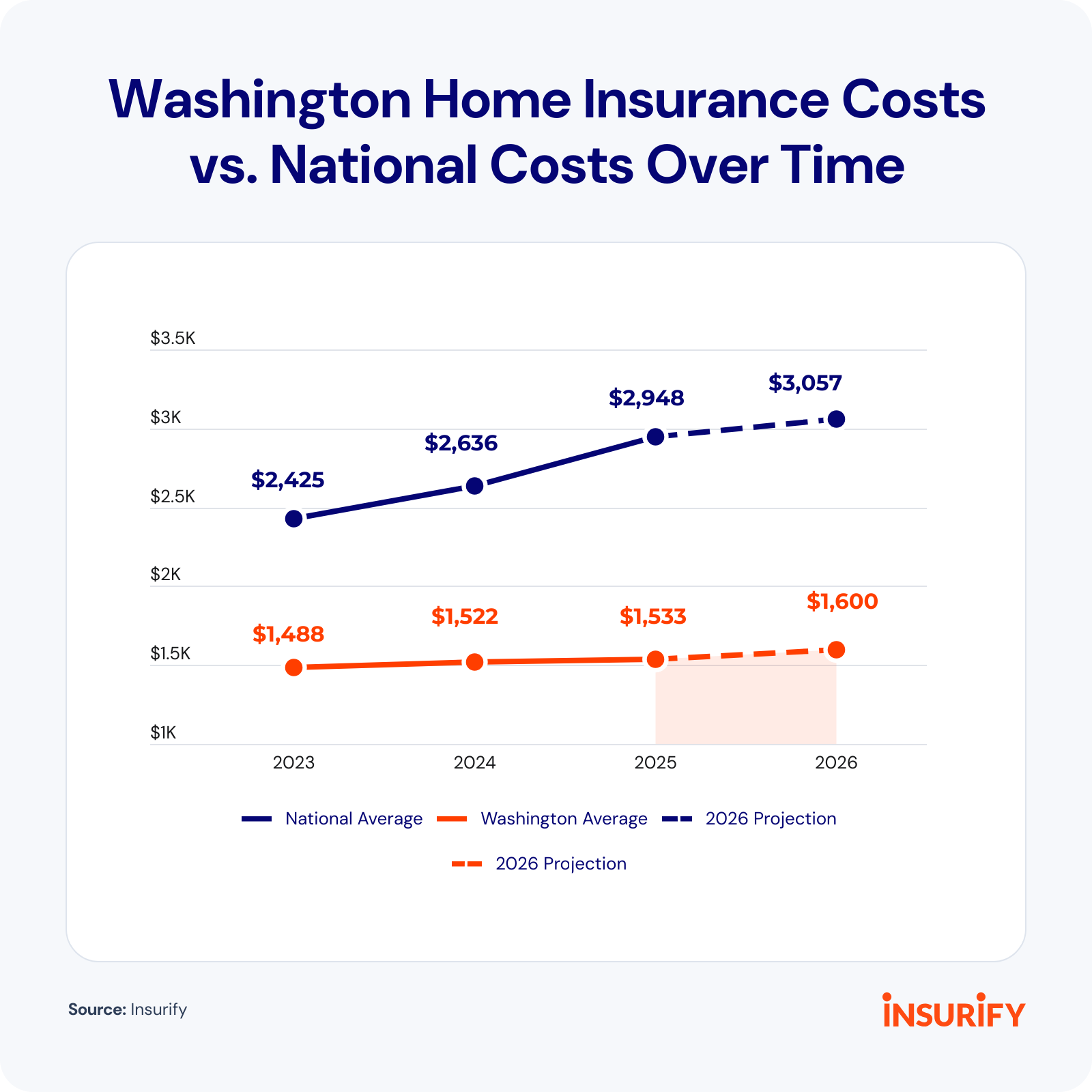 The average yearly home insurance premium in Washington State was $1,533 by the end of 2025, according to Insurify’s 2026 Insuring the American Homeowner Report. That’s almost half the national yearly average premium of $2,948.