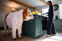 Tash Thompson, 26, has been sharing her home with 120kg calf June, who eagerly follows her around the kitchen and has even developed a mischievous habit of chewing through WiFi cables.