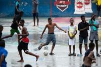 On a street in a suburb of Port-au-Prince, a dozen teenagers using stones for goalposts are immersed in a Sunday game of football as traffic winds around them.