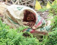 Tatau the Bornean orangutan peers out from a hessian sack at Paignton Zoo. (Paignton Zoo via SWNS