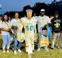“We would like for everyone to please stand. In loving memory on tonight, we dedicate this game to player No. 48,” the announcer says. She calls his name - “Jordan Lamar.” Loud clapping and cheering commences across the bleachers as his family steps forward carrying a life size freestanding carved image of Jordan in his football gear. The number 48 on his chest. “The son of Andre and Myeshia Lamar. He was a member of the football and baseball team. Jordan was loved by many. His smile would light up any room. And we honor him tonight. Once upon a saint, forever with Jordan. #48. Senior. Jordan Lamar.” The announcer concluded.
