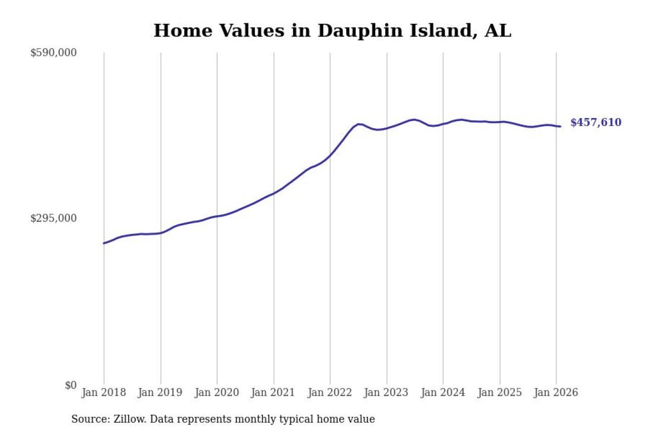 Stacker compiled a list of cities with the most expensive homes in the Mobile, AL metro area using data from Zillow. Charts show the monthly typical home value since January 2018.