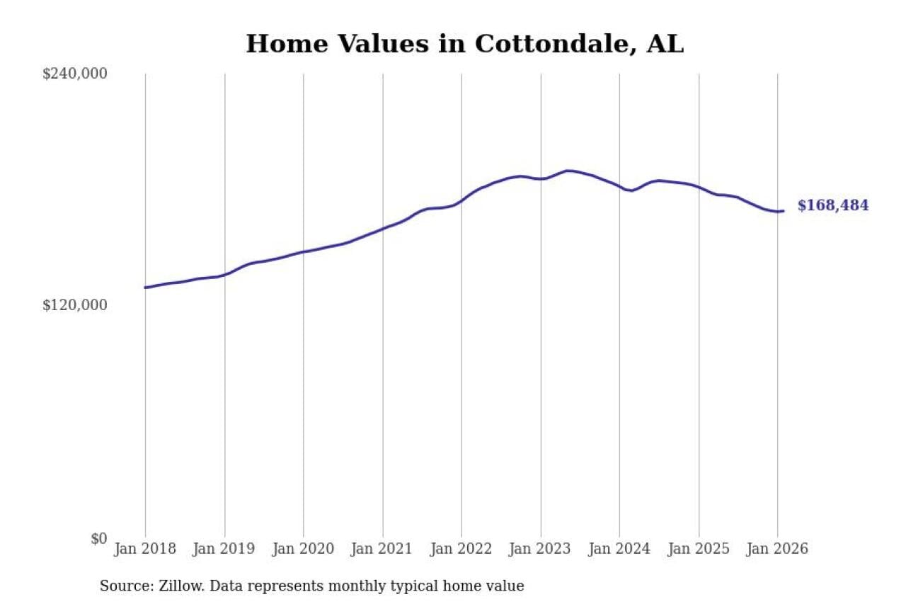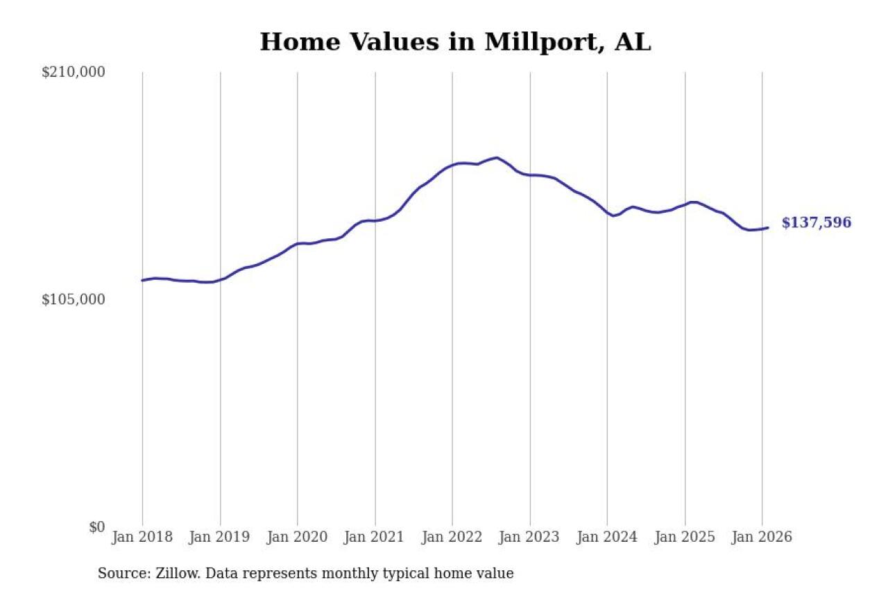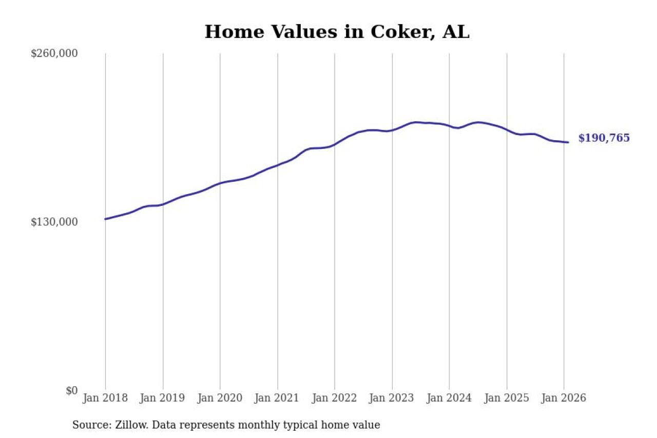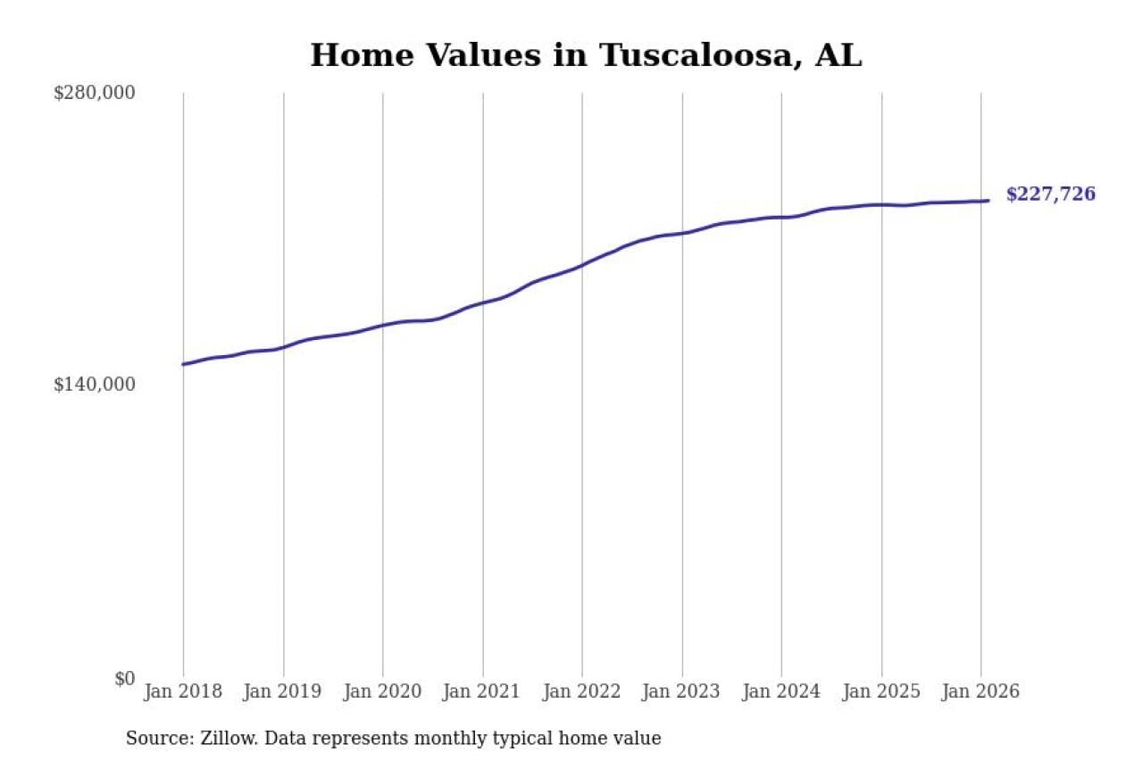 Stacker compiled a list of cities with the most expensive homes in the Tuscaloosa, AL metro area using data from Zillow. Charts show the monthly typical home value since January 2018.