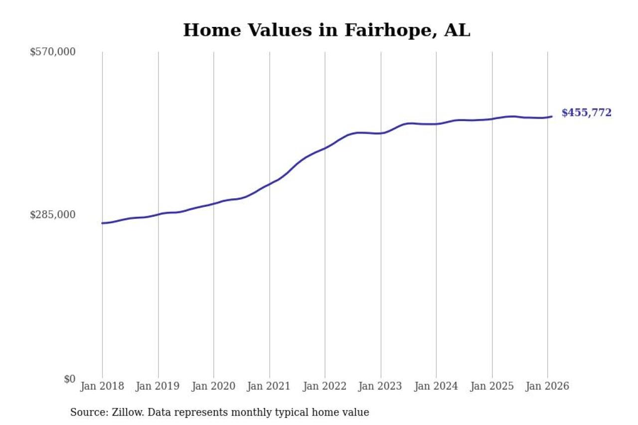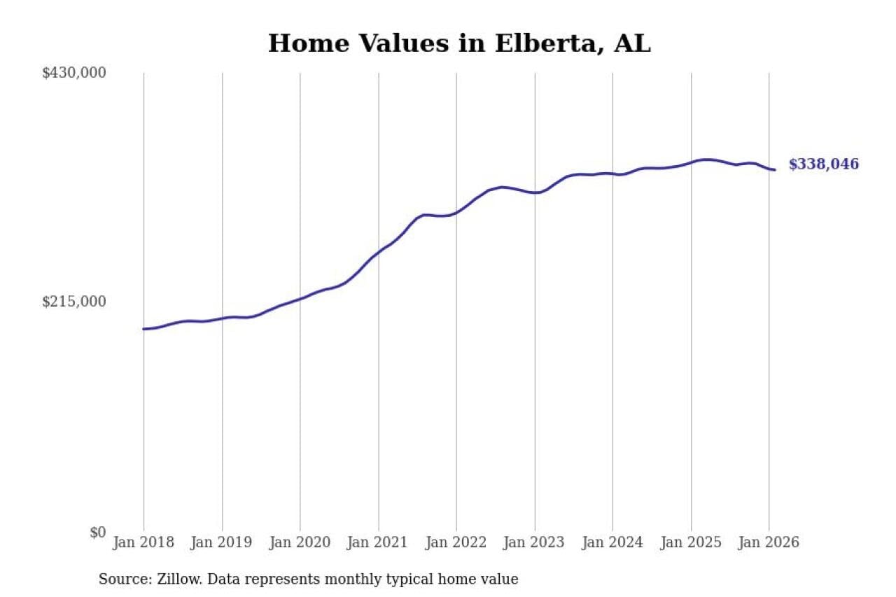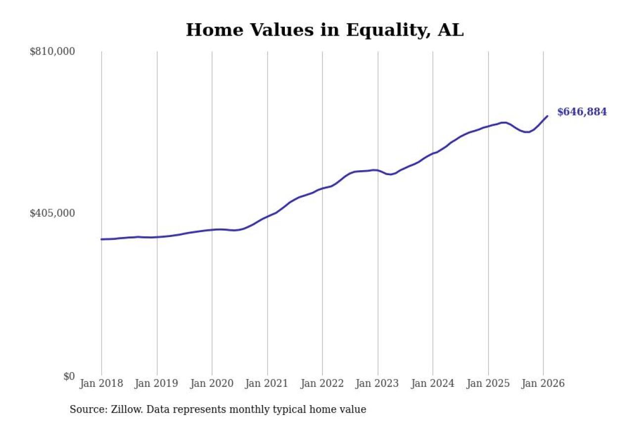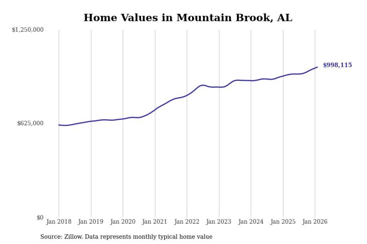 Stacker compiled a list of cities with the most expensive homes in Alabama using data from Zillow. Cities are ranked by the Zillow Home Values Index for all homes as of February 2026. The charts in this story were created automatically using Matplotlib.