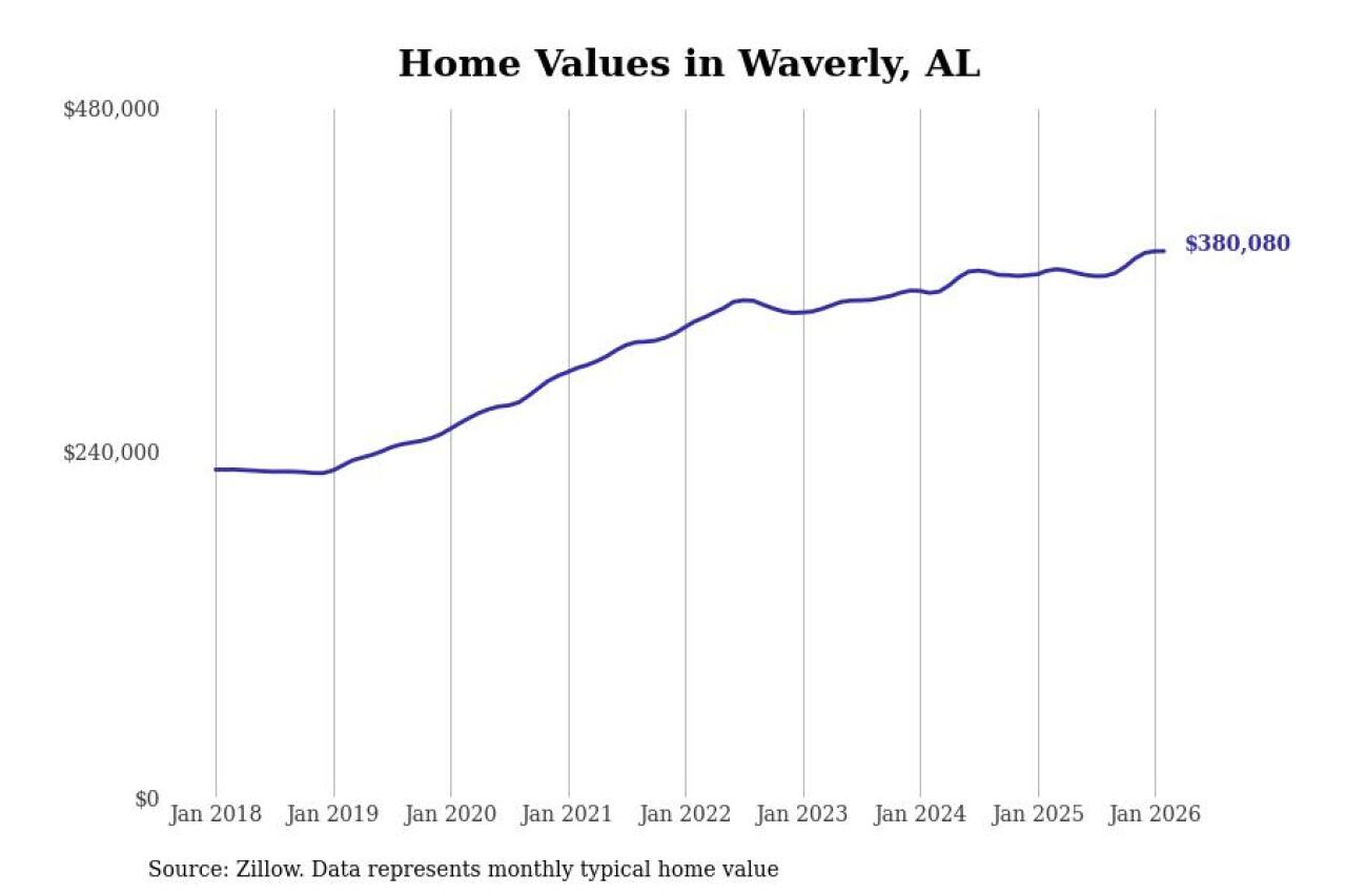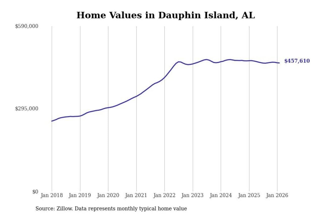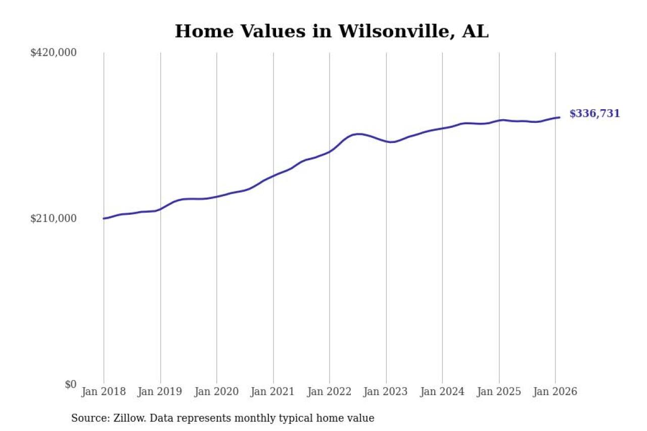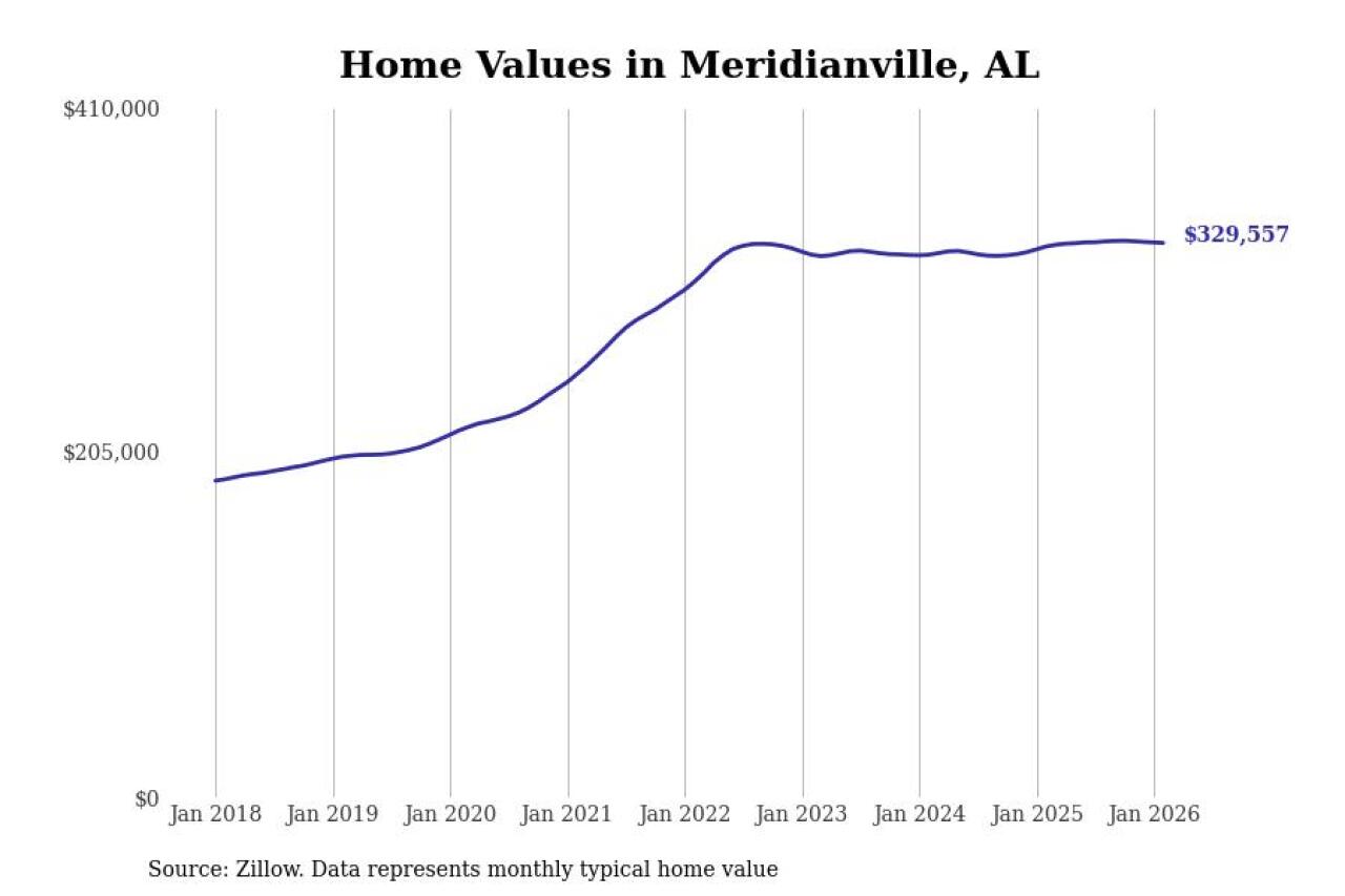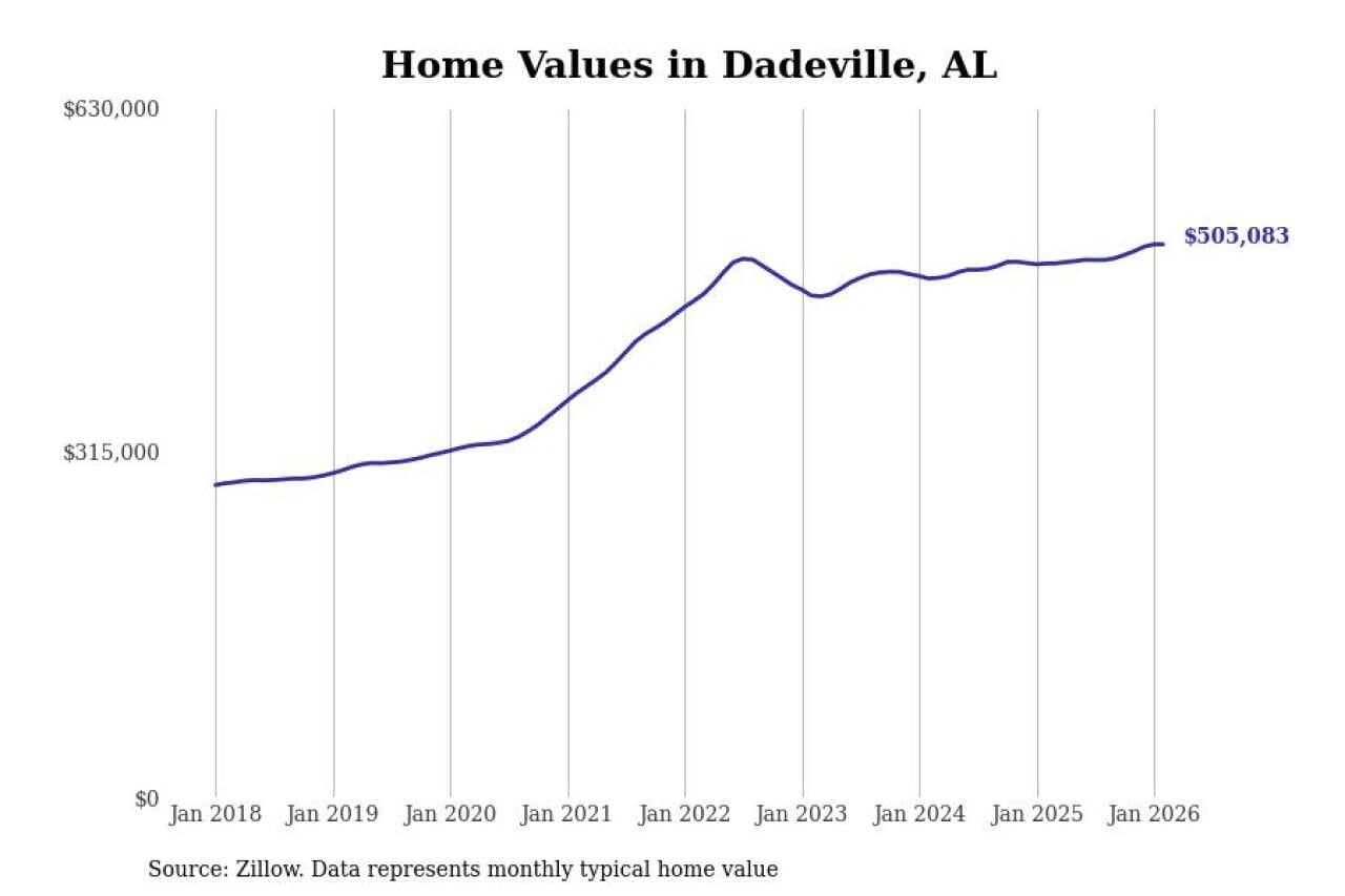 Stacker compiled a list of cities with the most expensive homes in Alabama using data from Zillow. Cities are ranked by the Zillow Home Values Index for all homes as of February 2026. The charts in this story were created automatically using Matplotlib.
