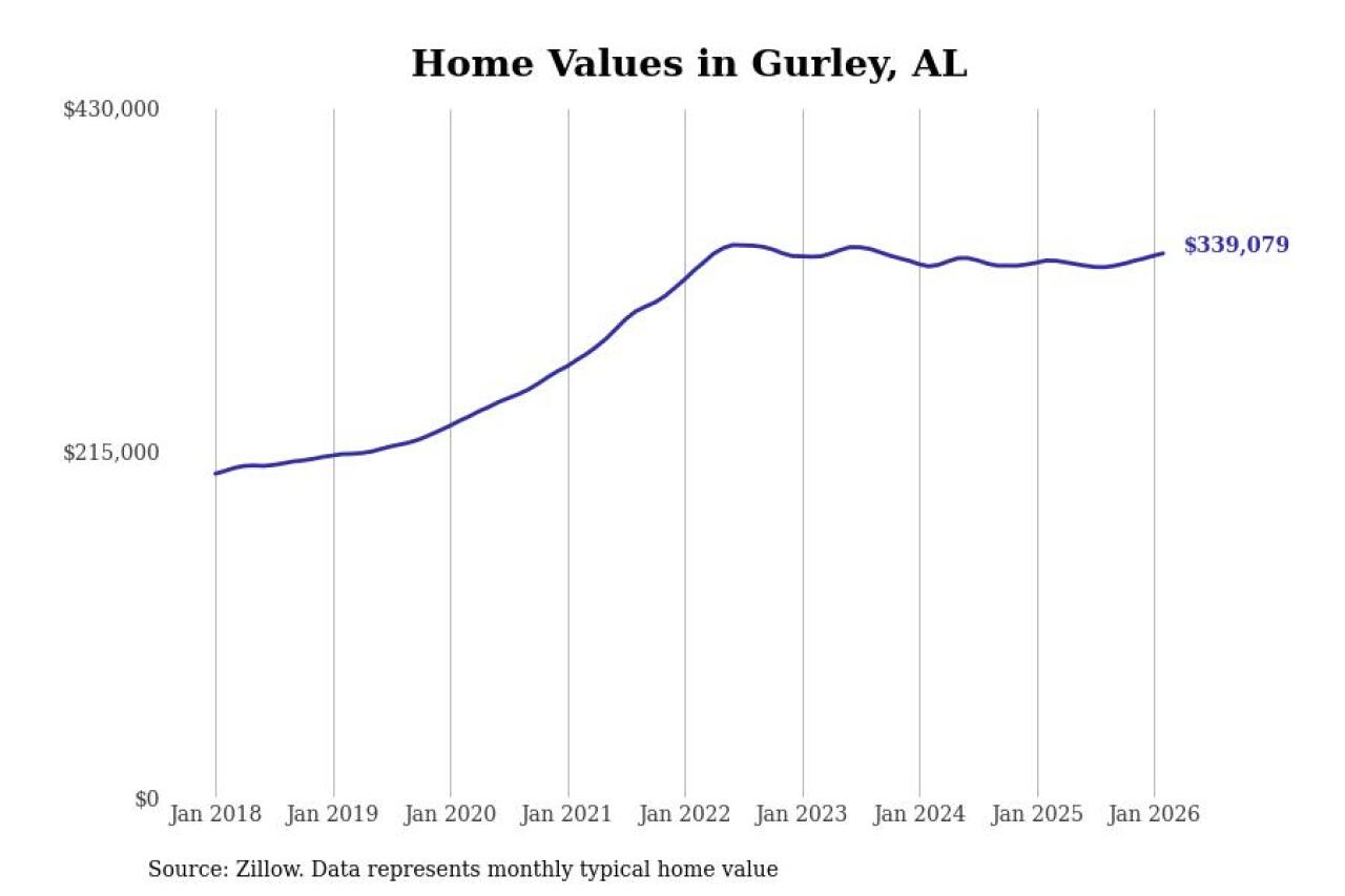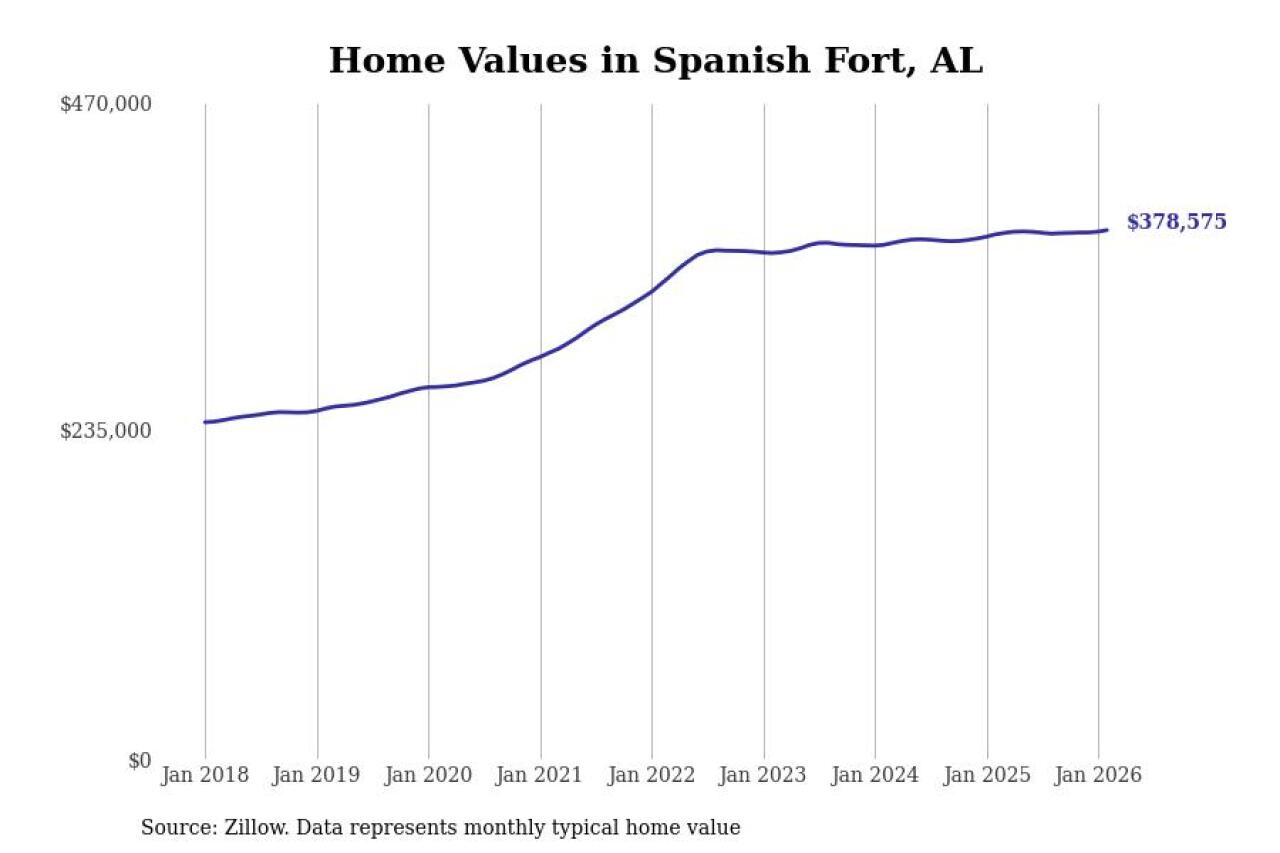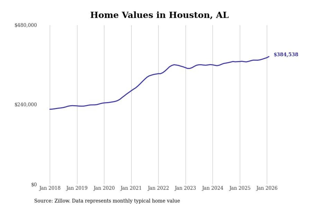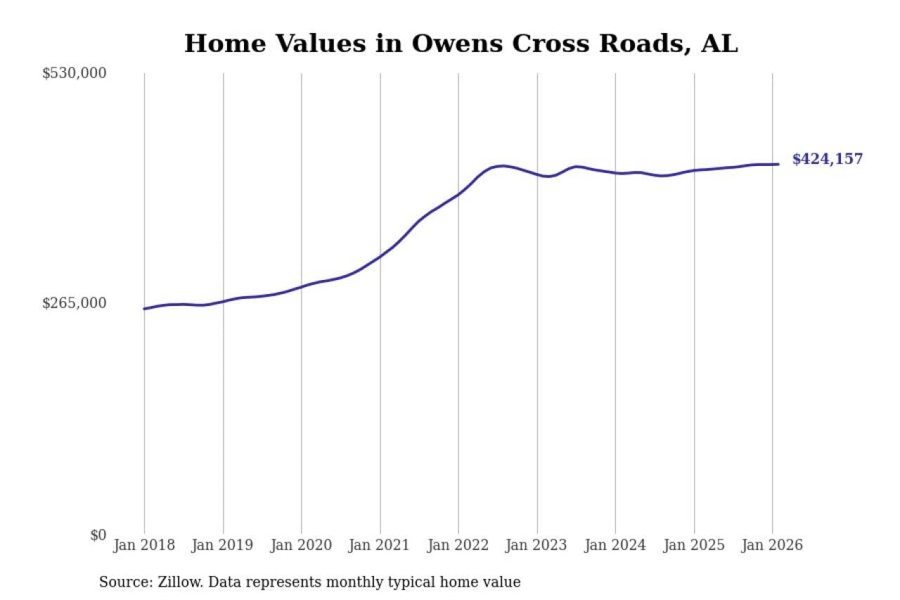 Stacker compiled a list of cities with the most expensive homes in Alabama using data from Zillow. Cities are ranked by the Zillow Home Values Index for all homes as of February 2026. The charts in this story were created automatically using Matplotlib.