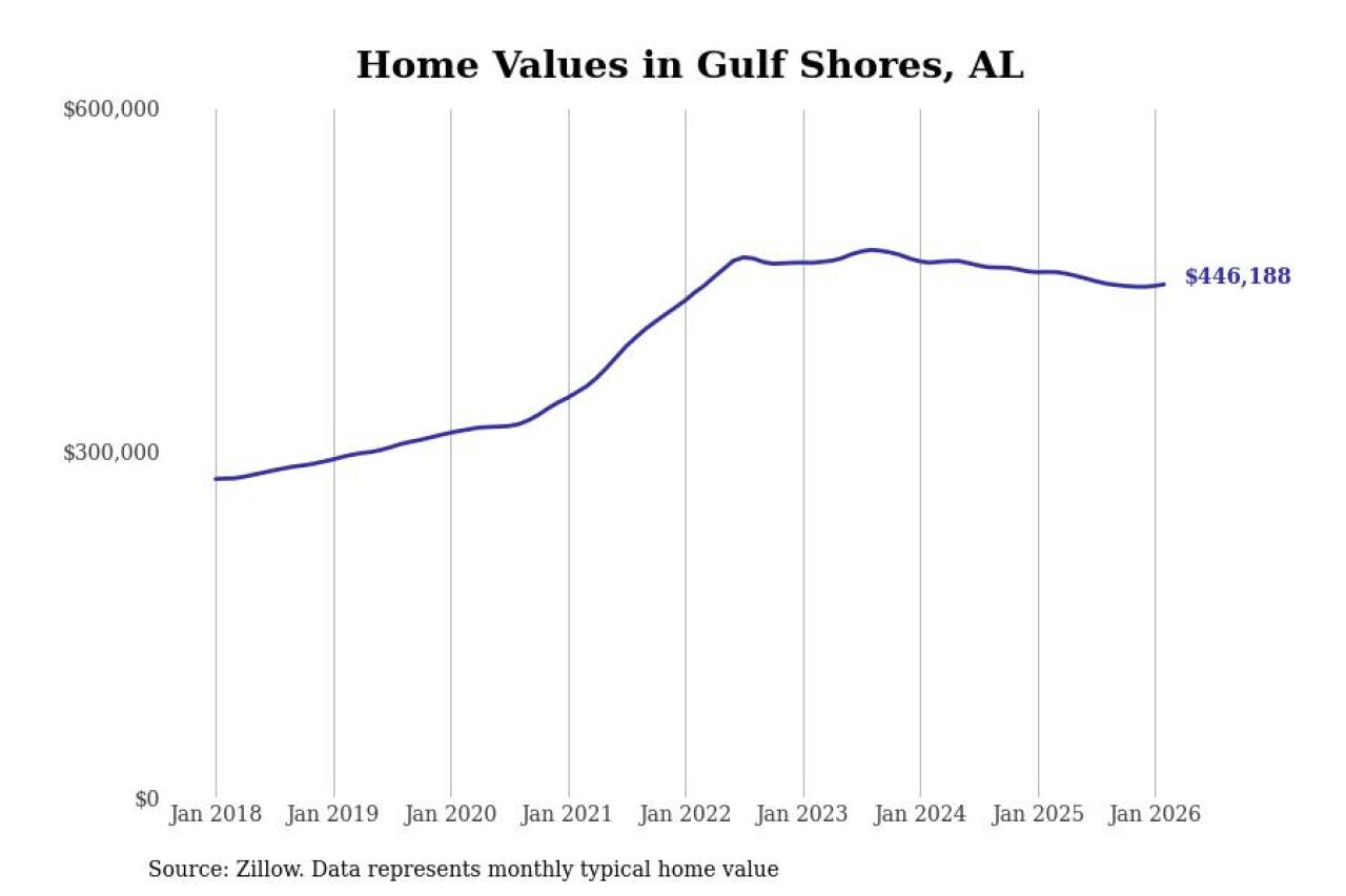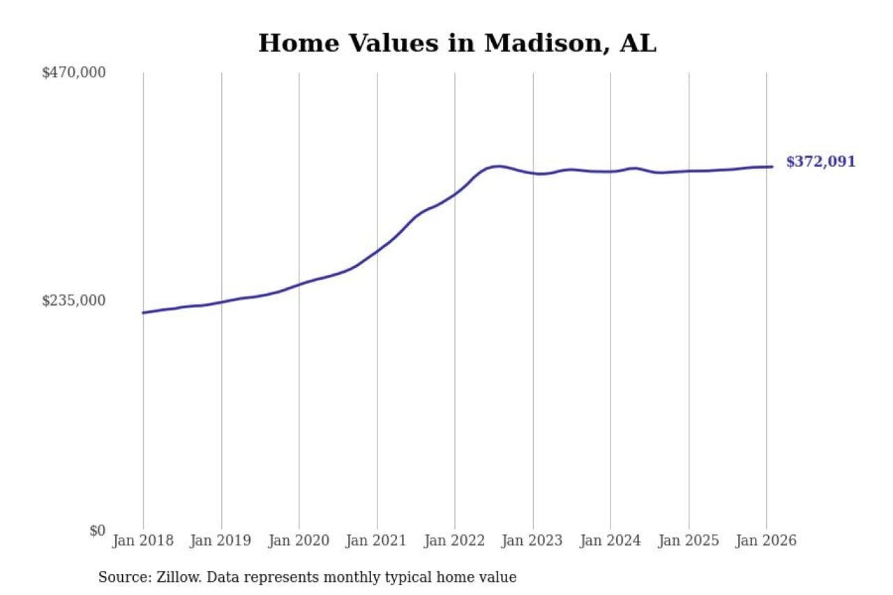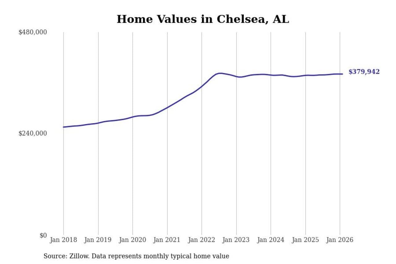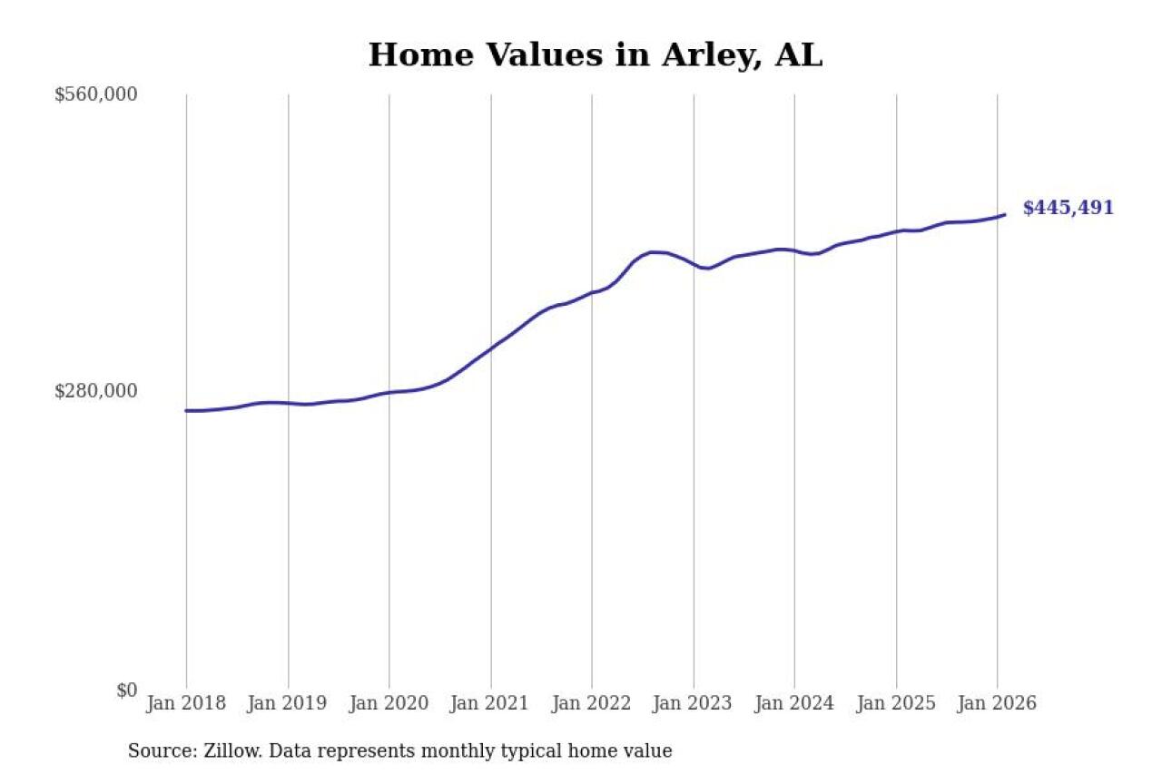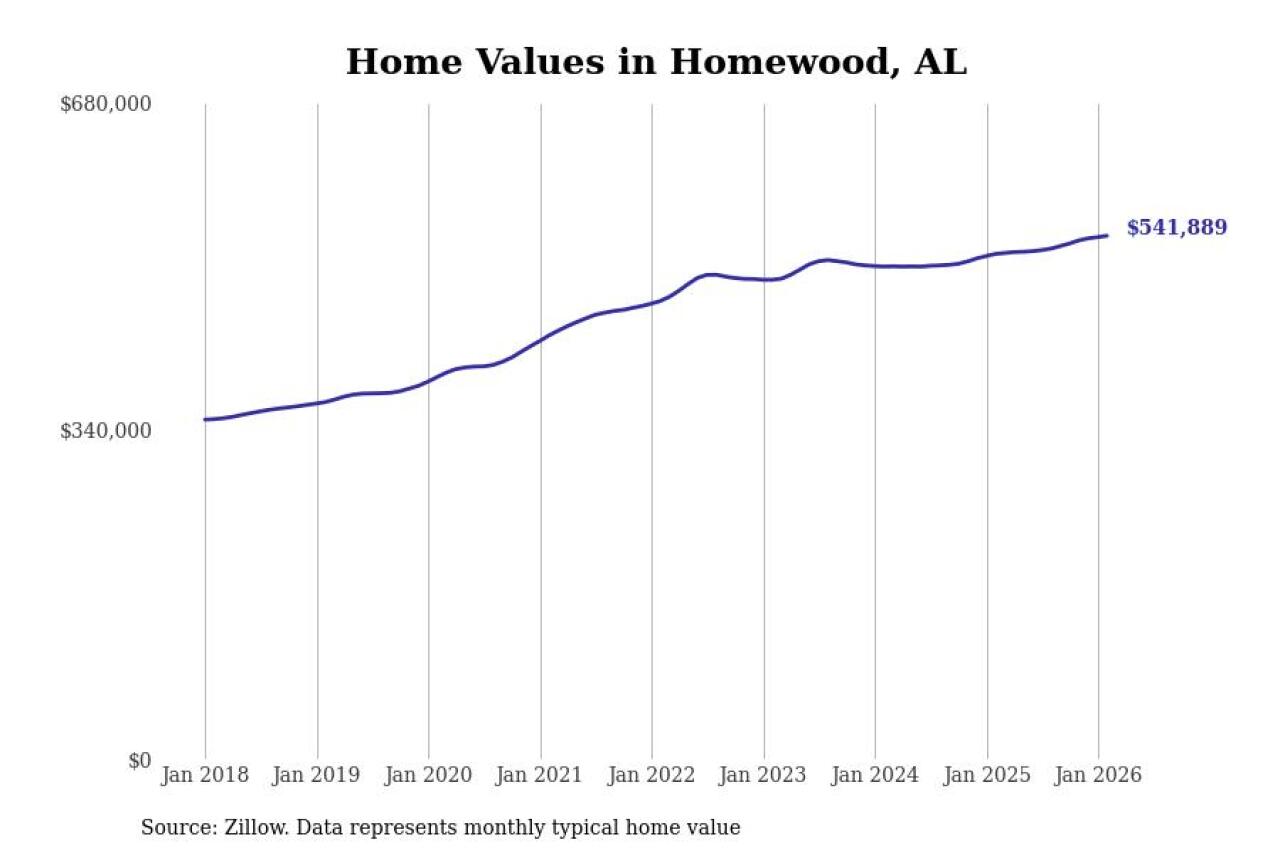 Stacker compiled a list of cities with the most expensive homes in Alabama using data from Zillow. Cities are ranked by the Zillow Home Values Index for all homes as of February 2026. The charts in this story were created automatically using Matplotlib.