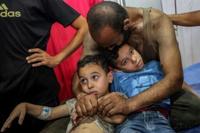 A man embraces two injured boys as they sit on a bed at al-Awda Hospital in Gaza's Nuseirat refugee camp on Sunday