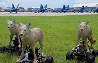 The robotic coyotes seen at a U.S. military air base, with airplanes in background from the Blue Angels flight demonstration squadron of the U…