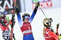 Federica Brignone celebrates after winning the Women's Giant Slalom in Sestriere