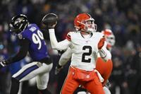 Jan 4, 2025; Baltimore, Maryland, USA; Cleveland Browns quarterback Bailey Zappe (2) makes a pass during the third quarter against the Baltimo…