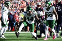 Oct 27, 2024; Foxborough, Massachusetts, USA; New York Jets linebacker Jamien Sherwood (44) reacts after breaking up a pass against the New En…