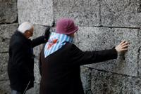 Survivors, some wearing scarves in the blue-and-white stripes of their death camp uniforms, laid flowers at the site