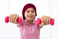 Lifestyle Exercise Improves Odds Against Cancer May 27, 2025 Cutout of pink plastic dumbbell grabbed by hands of cheerful Asian woman patient of breast cancer as physical therapy and exercise tool for st…
