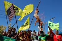 Demonstrators burn US President Donald Trump in effigy during a protest following his imposition of trade taxes and sanctions